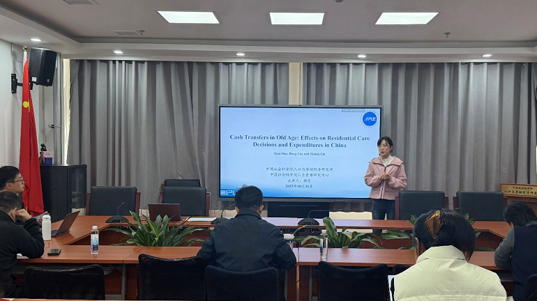2025年10月31日下午,人口与劳动经济研究所第39期学术论坛“老年现金转移支付对养老机构选择及支出的影响”在我所一层会议室举办。副研究员韩笑担任主讲人,助理研究员许多担任主持人。主讲人介绍了高龄津贴对老年人入住养老机构的概率与机构养老消费支出的影响及其作用机制,发现高龄津贴能够鼓励家庭在高收入弹性的项目上增加投入,并减缓老年人健康恶化的速度。中国社会科学院中国式现代化研究院调查研究部副主任、副研究员戈艳霞和我所助理研究员王晓宇进行了点评和讨论。戈艳霞老师建议进一步挖掘80岁时老年群体能够享受的政策福利包,在此基础上计算高龄津贴的边际消费倾向。王晓宇老师建议关注机构养老决策的制定过程,明确家庭成员扮演的角色。其他参会老师围绕服务补贴与现金补贴政策的有效性进行了广泛发言和讨论。